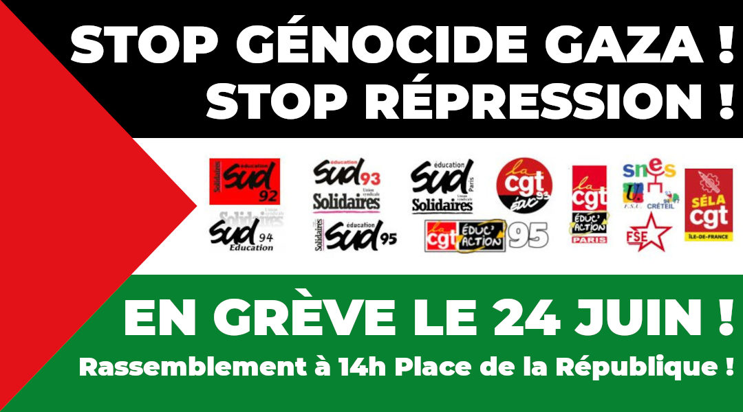 - à une deuxième journée francilienne de grève contre le génocide à Gaza et contre la répression le mardi 24 juin