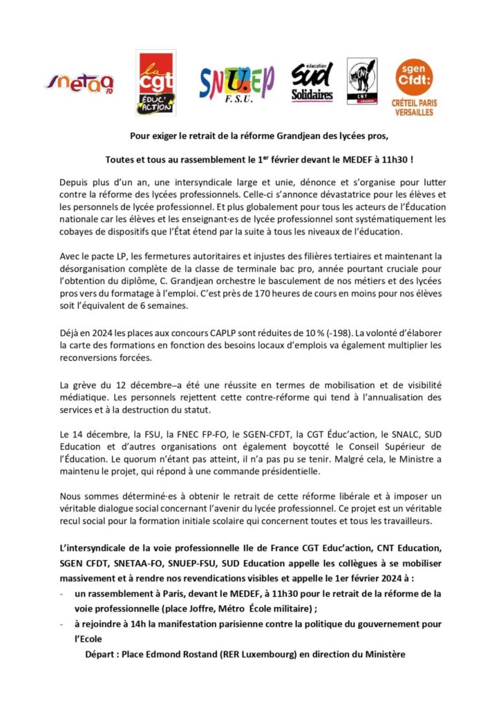 Pour exiger le retrait de la réforme Grandjean des lycées pros, Toutes et tous au rassemblement le 1er février devant le MEDEF à 11h30 !