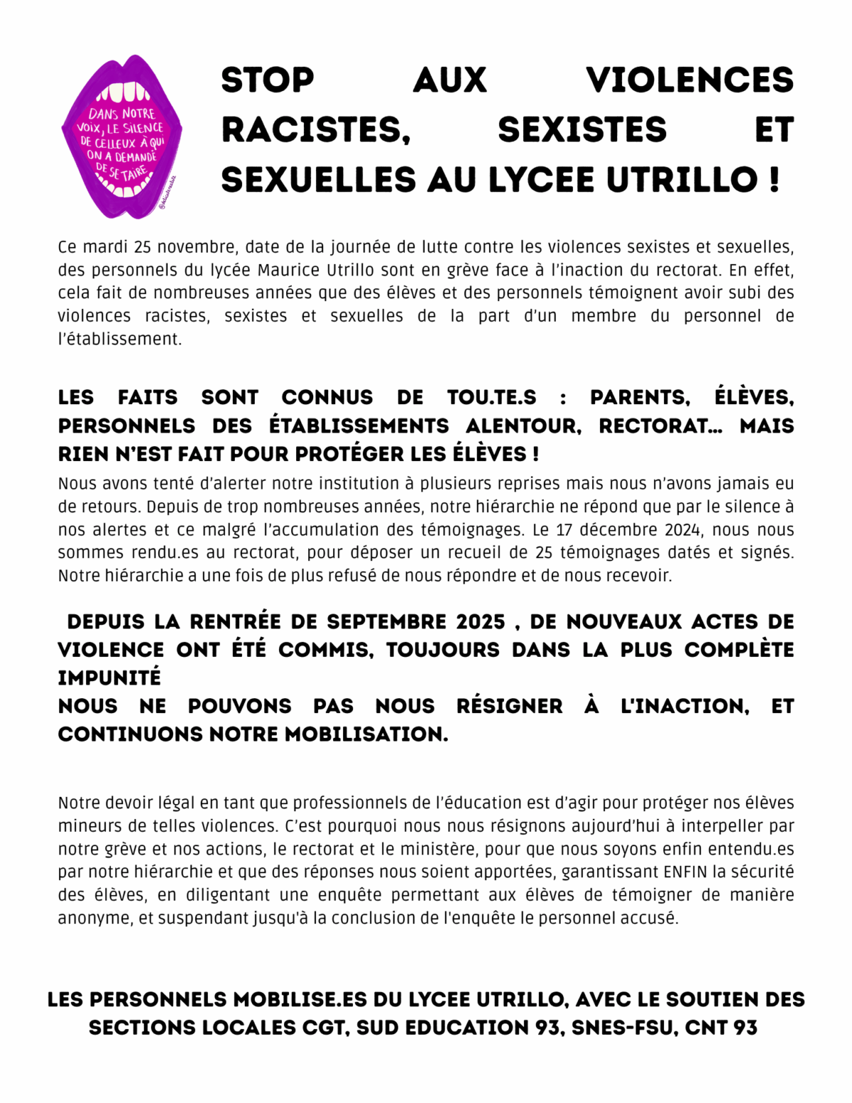 STOP aux violences racistes, sexistes et sexuelles Au Lycee Utrillo !