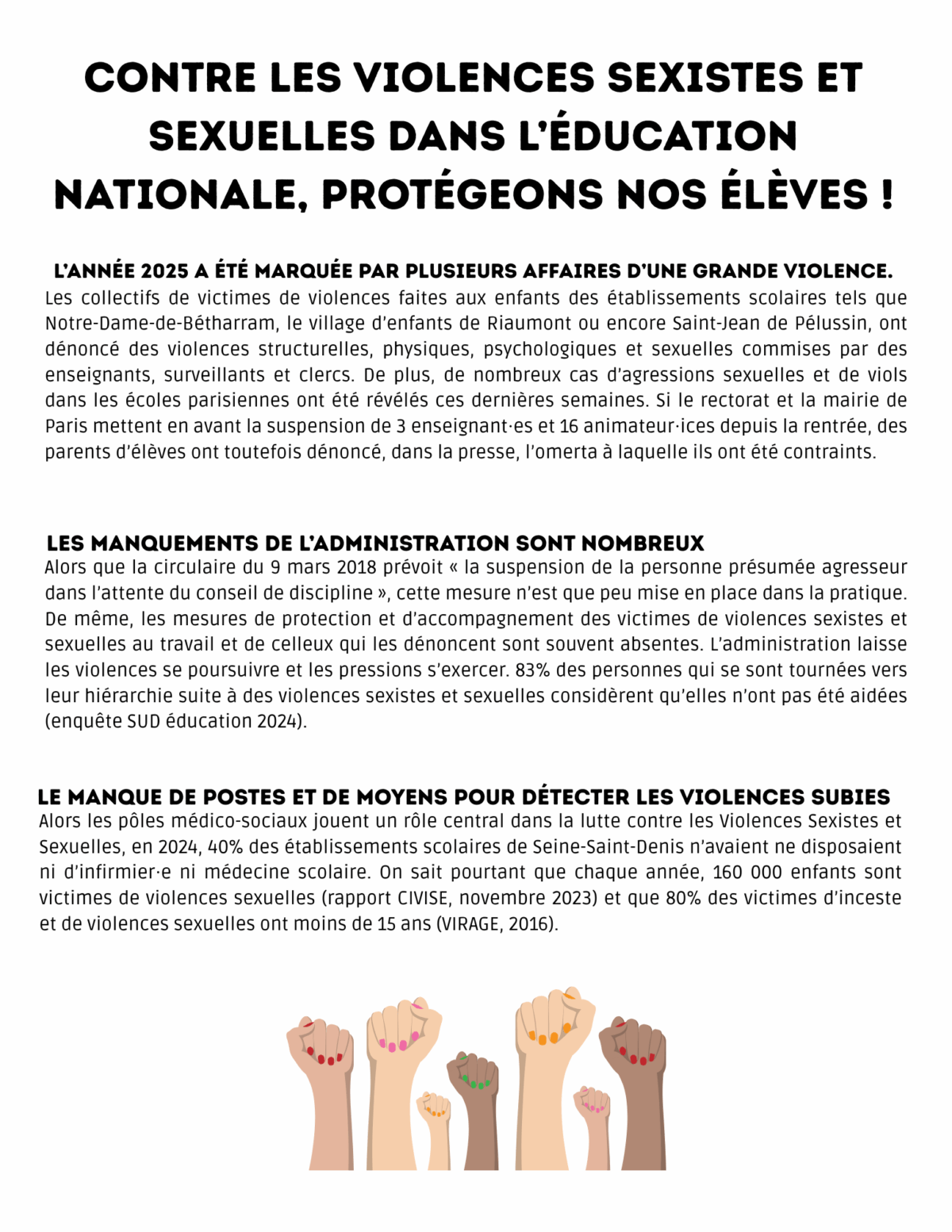 Les collectifs de victimes de violences faites aux enfants des établissements scolaires tels que Notre-Dame-de-Bétharram, le village d’enfants de Riaumont ou encore Saint-Jean de Pélussin, ont dénoncé des violences structurelles, physiques, psychologiques et sexuelles commises par des enseignants, surveillants et clercs. De plus, de nombreux cas d’agressions sexuelles et de viols dans les écoles parisiennes ont été révélés ces dernières semaines. Si le rectorat et la mairie de Paris mettent en avant la suspension de 3 enseignant·es et 16 animateur·ices depuis la rentrée, des parents d’élèves ont toutefois dénoncé, dans la presse, l’omerta à laquelle ils ont été contraints.