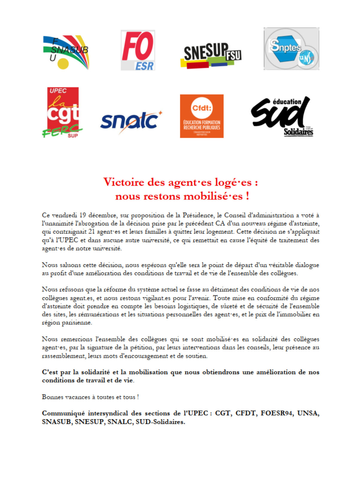 Ce vendredi 19 décembre, sur proposition de la Présidence, le Conseil d'administration a voté à l'unanimité l'abrogation de la décision prise par le précédent CA d'un nouveau régime d'astreinte, qui contraignait 21 agent·es et leurs familles à quitter leur logement. Cette décision ne s’appliquait qu’à l’UPEC et dans aucune autre université, ce qui remettait en cause l’équité de traitement des agent·es de notre université.