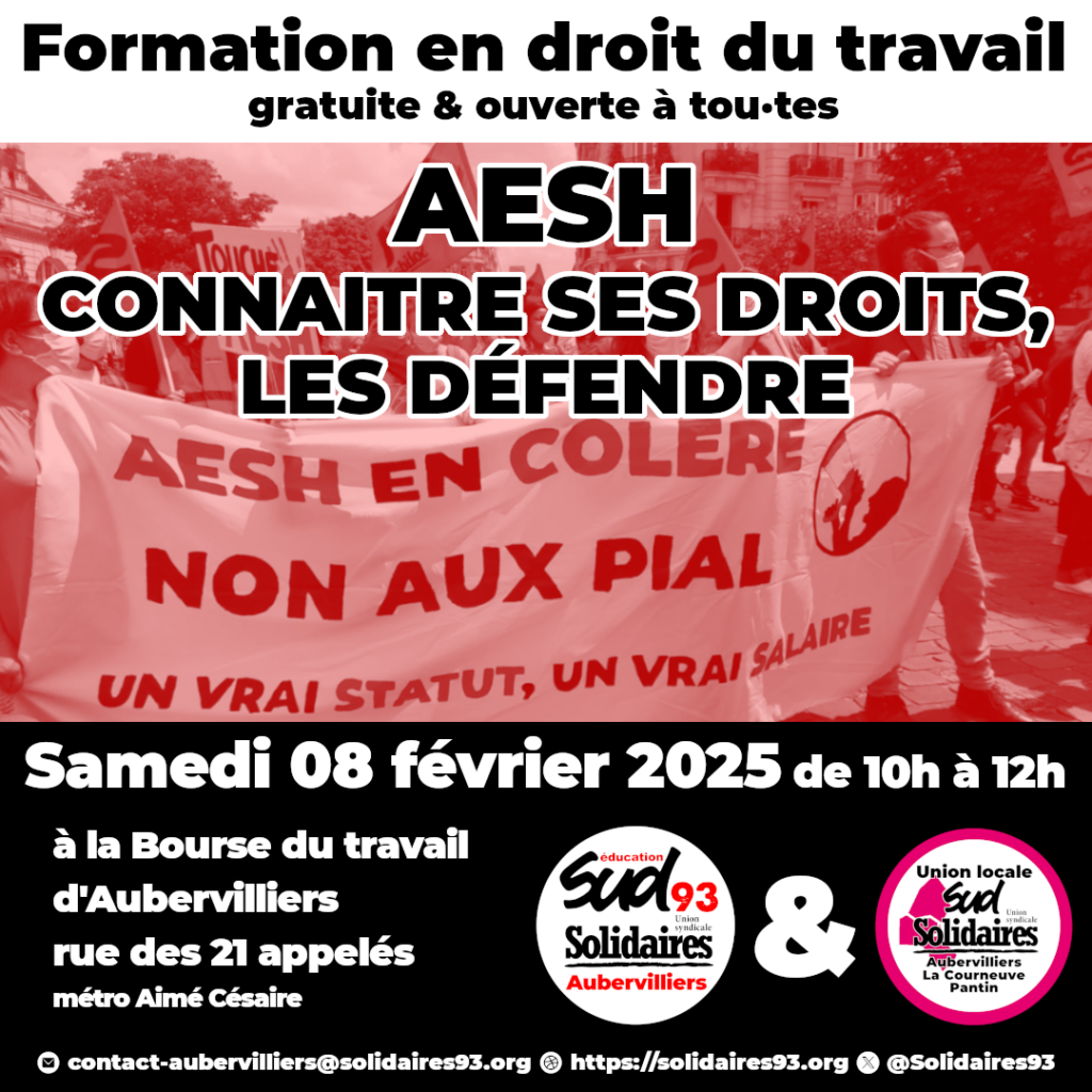 L’Union locale Aubervilliers des syndicats SUD-Solidaires organise régulièrement des formations gratuites en droit du travail ouvertes à toutes et tous.