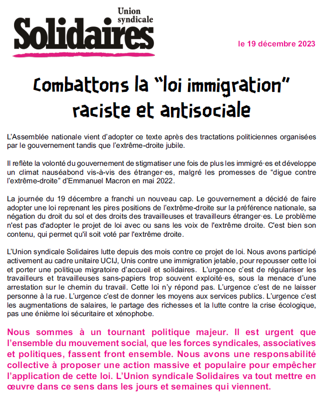 L’Union syndicale Solidaires lutte depuis des mois contre ce projet de loi. Nous avons participé activement au cadre unitaire UCIJ, Unis contre une immigration jetable, pour repousser cette loi et porter une politique migratoire d’accueil et solidaires. L’urgence c’est de régulariser les travailleurs et travailleuses sans-papiers trop souvent exploité·es, sous la menace d’une arrestation sur le chemin du travail. Cette loi n’y répond pas. L’urgence c’est de ne laisser personne à la rue. L’urgence c’est de donner les moyens aux services publics. L’urgence c’est les augmentations de salaires, le partage des richesses et la lutte contre la crise écologique, pas une énième loi sécuritaire et xénophobe.