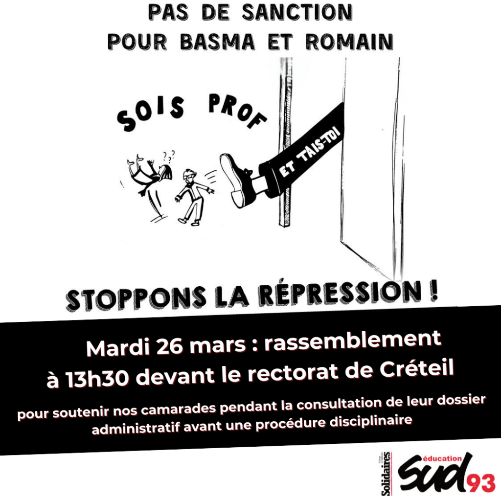 Enfin, la convocation préalable à l’engagement d’une procédure à l’encontre de deux enseignants syndiqués, dans un contexte de mobilisations, particulièrement en Seine-Saint-Denis, et alors même que nos courriers restent sans réponse pour une demande d’audience, nous interroge. Il serait dommage que le Rectorat donne l’impression d’être plus prompt à sanctionner des collègues sur la base d’un rapport partial et d’une véracité contestable qu’à pallier les manques de moyens matériels et humains dont les usagers de l’établissement souffrent au quotidien.