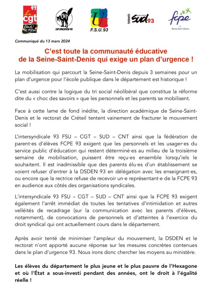 L'intersyndicale 93 FSU – CGT – SUD – CNT ainsi que la FCPE 93 exigent également l’arrêt immédiat de toutes les tentatives d’intimidation et autres velléités de recadrage (sur la communication avec les parents d’élèves, notamment), de convocations de personnels et d’atteintes à l’exercice du droit syndical qui ont actuellement cours dans le département.