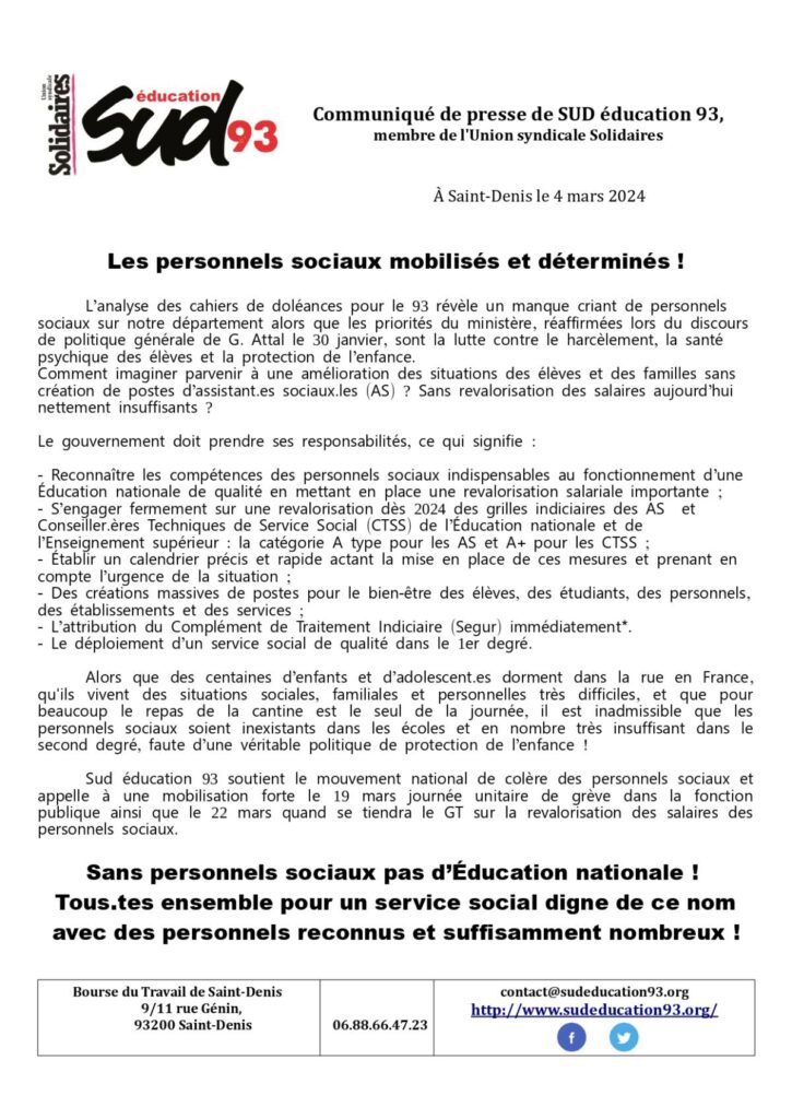 Sud éducation 93 soutient le mouvement national de colère des personnels sociaux et appelle à une mobilisation forte le 19 mars journée unitaire de grève dans la fonction publique ainsi que le 22 mars quand se tiendra le GT sur la revalorisation des salaires des personnels sociaux.