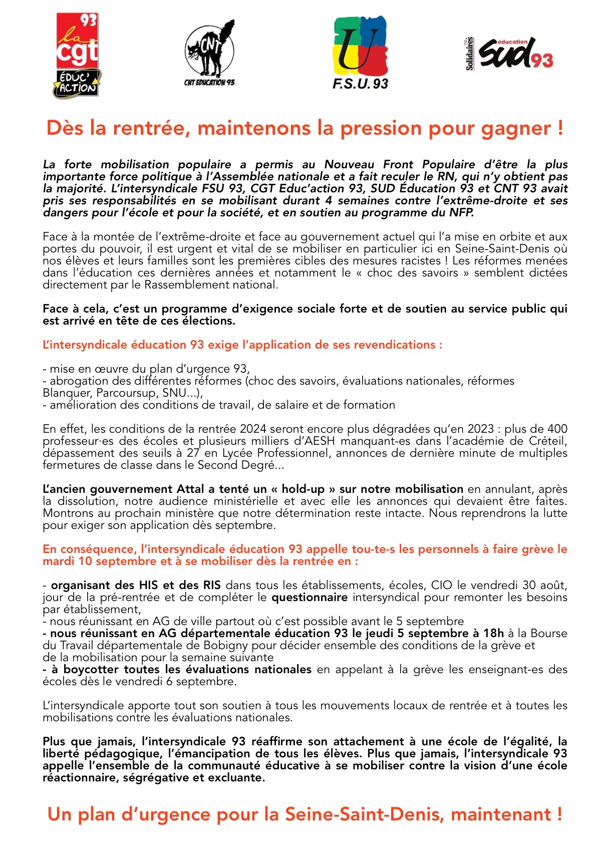 - nous réunissant en AG départementale éducation 93 le jeudi 5 septembre à 18h à la Bourse du Travail départementale de Bobigny pour décider ensemble des conditions de la grève et de la mobilisation pour la semaine suivante
