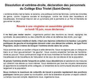 Nous, personnels du lycée Paul Eluard de Saint-Denis, réuni.e.s en assemblée générale le lundi 10 juin 2024, au lendemain des résultats des élections européennes et de l’annonce de la dissolution de l’Assemblée nationale, appelons à l’unité de tous les personnels de l’éducation dans la lutte contre l’extrême droite.