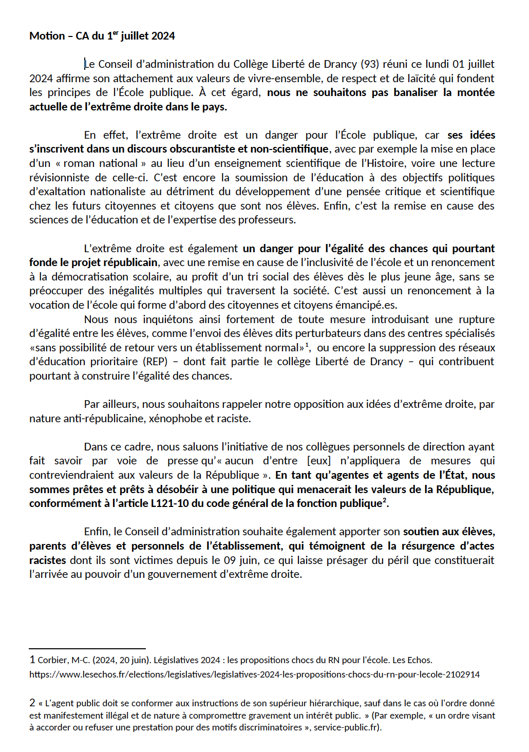 Le Conseil d’administration du Collège Liberté de Drancy (93) réuni ce lundi 01 juillet 2024 affirme son attachement aux valeurs de vivre-ensemble, de respect et de laïcité qui fondent les principes de l’École publique. À cet égard, nous ne souhaitons pas banaliser la montée actuelle de l’extrême droite dans le pays.
