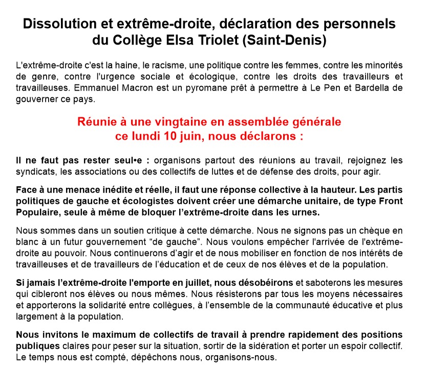 Nous, personnels du lycée Paul Eluard de Saint-Denis, réuni.e.s en assemblée générale le lundi 10 juin 2024, au lendemain des résultats des élections européennes et de l’annonce de la dissolution de l’Assemblée nationale, appelons à l’unité de tous les personnels de l’éducation dans la lutte contre l’extrême droite.