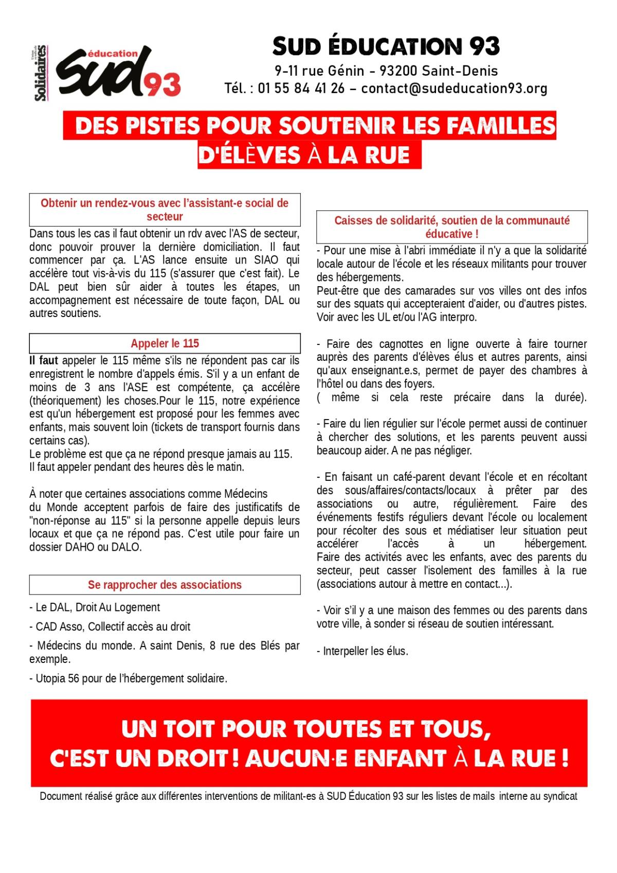 - Pour une mise à l'abri immédiate il n'y a que la solidarité locale autour de l'école et les réseaux militants pour trouver des hébergements. Peut-être que des camarades sur vos villes ont des infos sur des squats qui accepteraient d'aider, ou d'autres pistes. Voir avec les UL et/ou l'AG interpro.