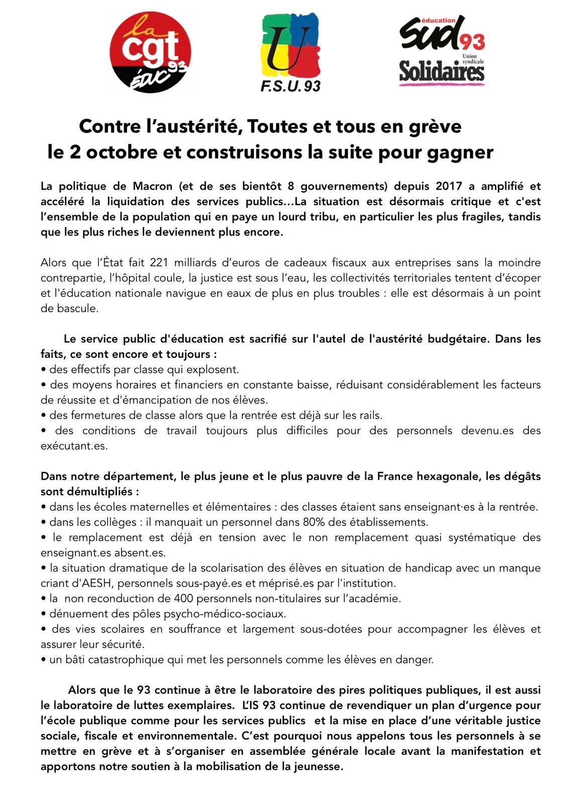 L'appel de l'intersyndicale éducation 93