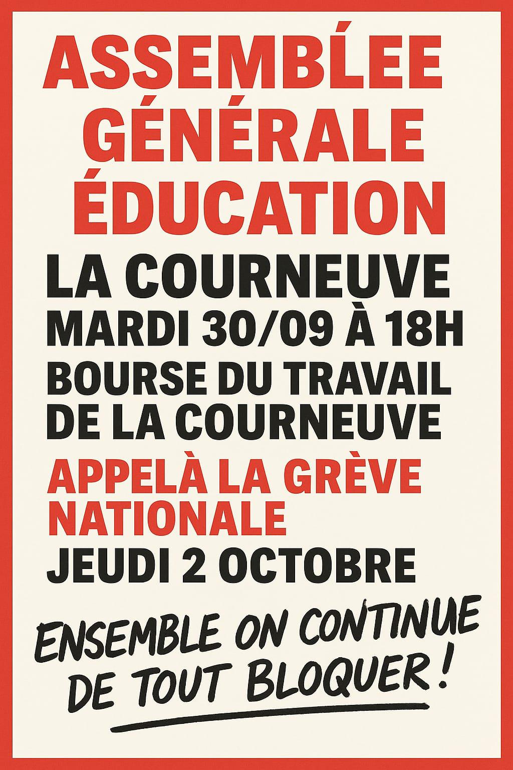 - La Courneuve : Assemblée Générale éducation, mardi 30 septembre, 18h, bourse du travail