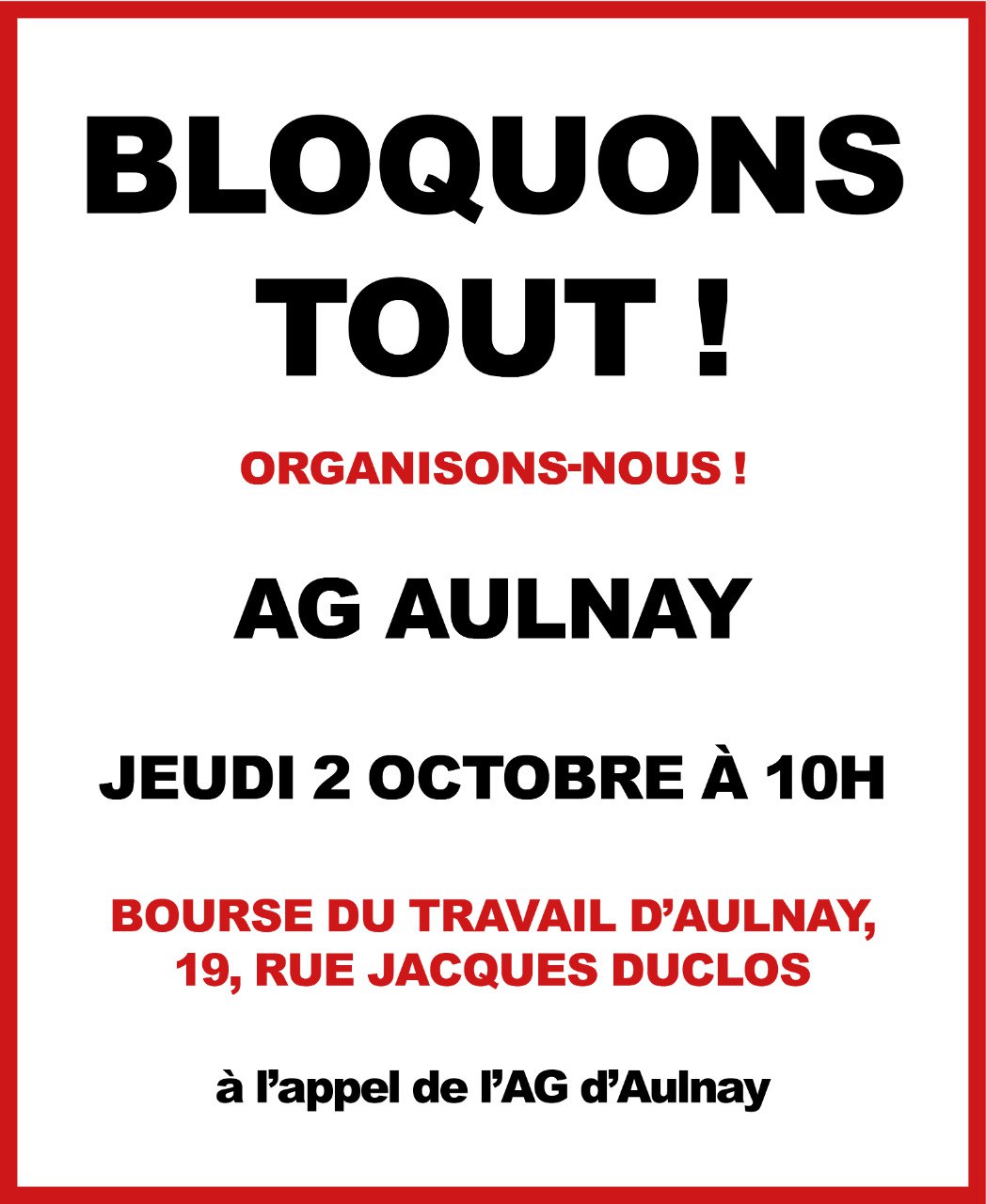 - Aulnay-sous-Bois : Assemblée Générale jeudi 2 octobre, 10h à la bourse du travail