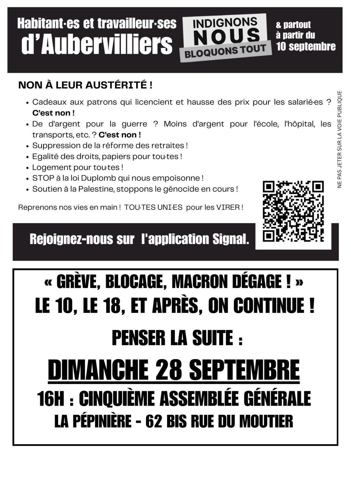 - Aubervilliers : Assemblée Générale du mouvement bloquons-tout dimanche 28 septembre, 16h, la Pépinière, rue du Moutiers