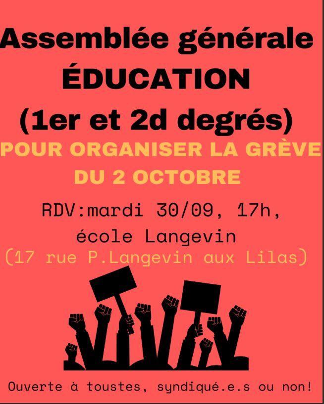 - Les Lilas : Assemblée Générale éducation, mardi 30 septembre, 17h, école Langevin