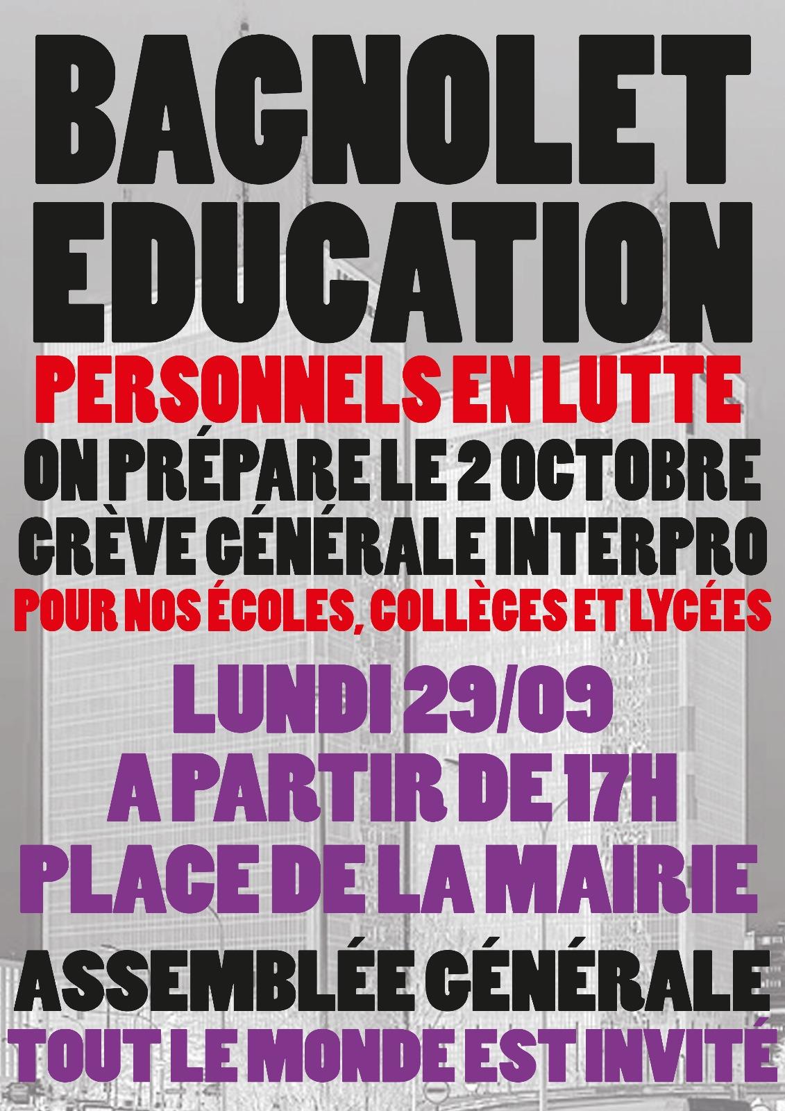 - Bagnolet : Assemblée générale éducation, lundi 29 septembre, 17h, place de la mairie