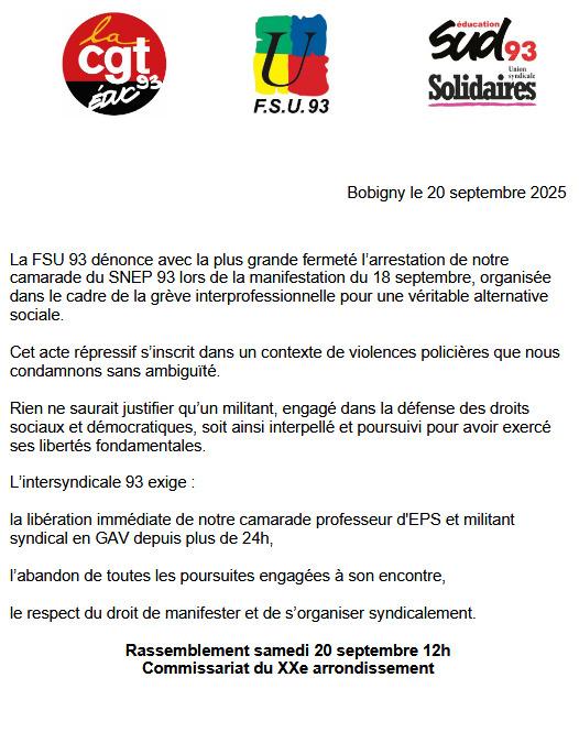 La FSU 93 dénonce avec la plus grande fermeté l'arrestation de notre camarade du SNEP 93 lors de la manifestation du 18 septembre, organisée dans le cadre de la grève interprofessionnelle pour une véritable alternative sociale.
