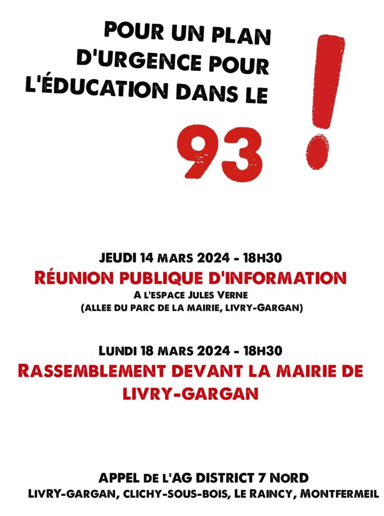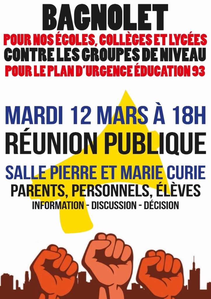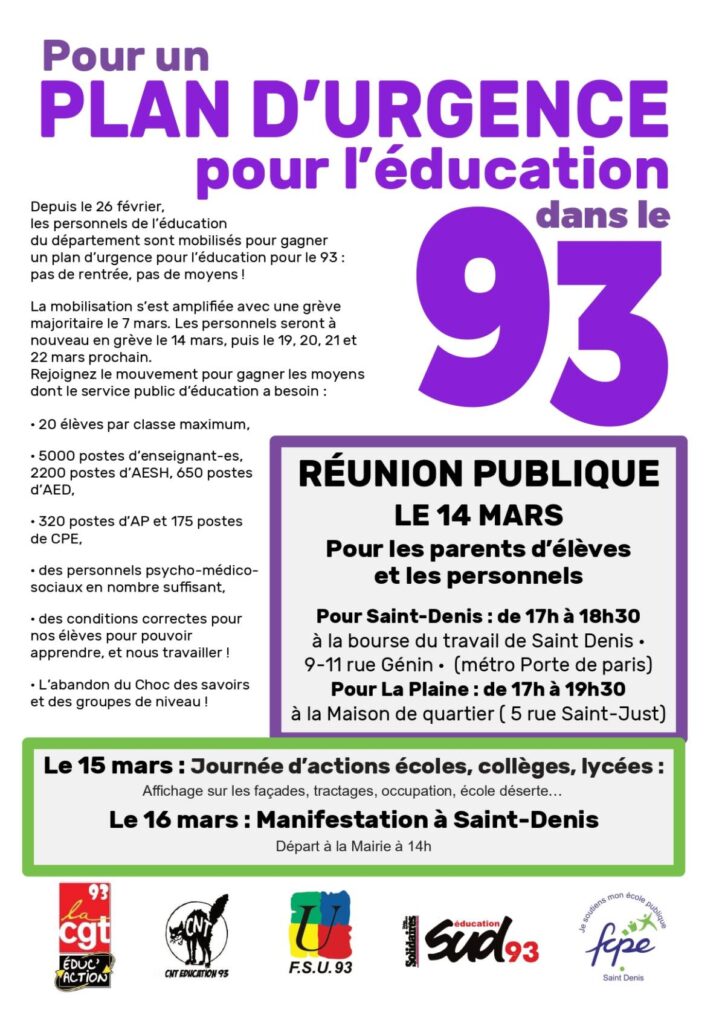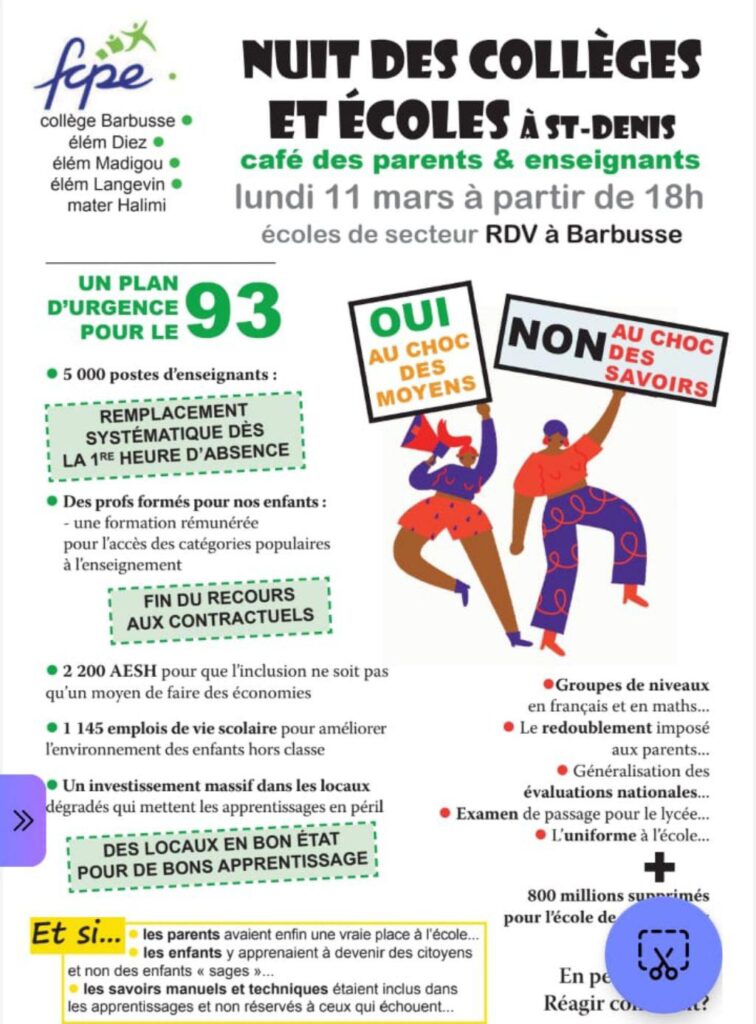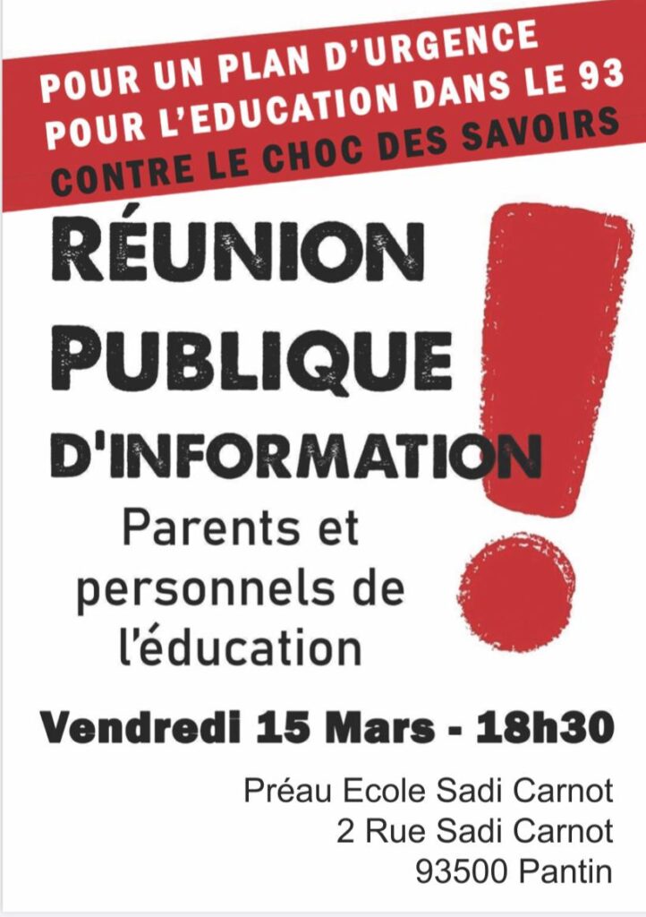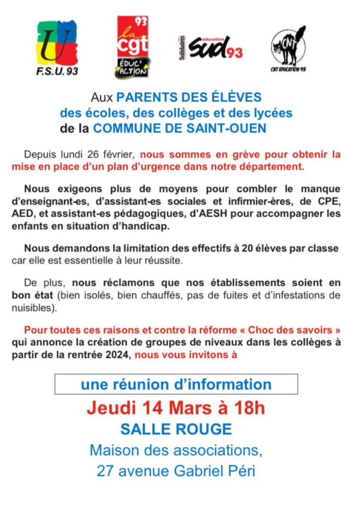 Jeudi 14 mars : Réunion publique parent professeur à 17h à la Bourse du travail de Saint-Denis !
