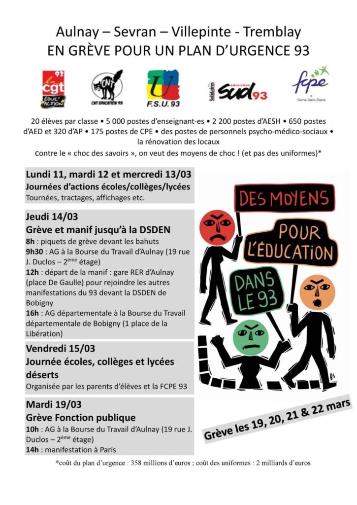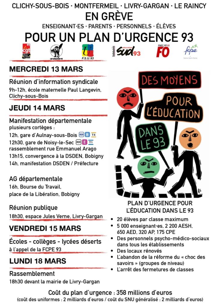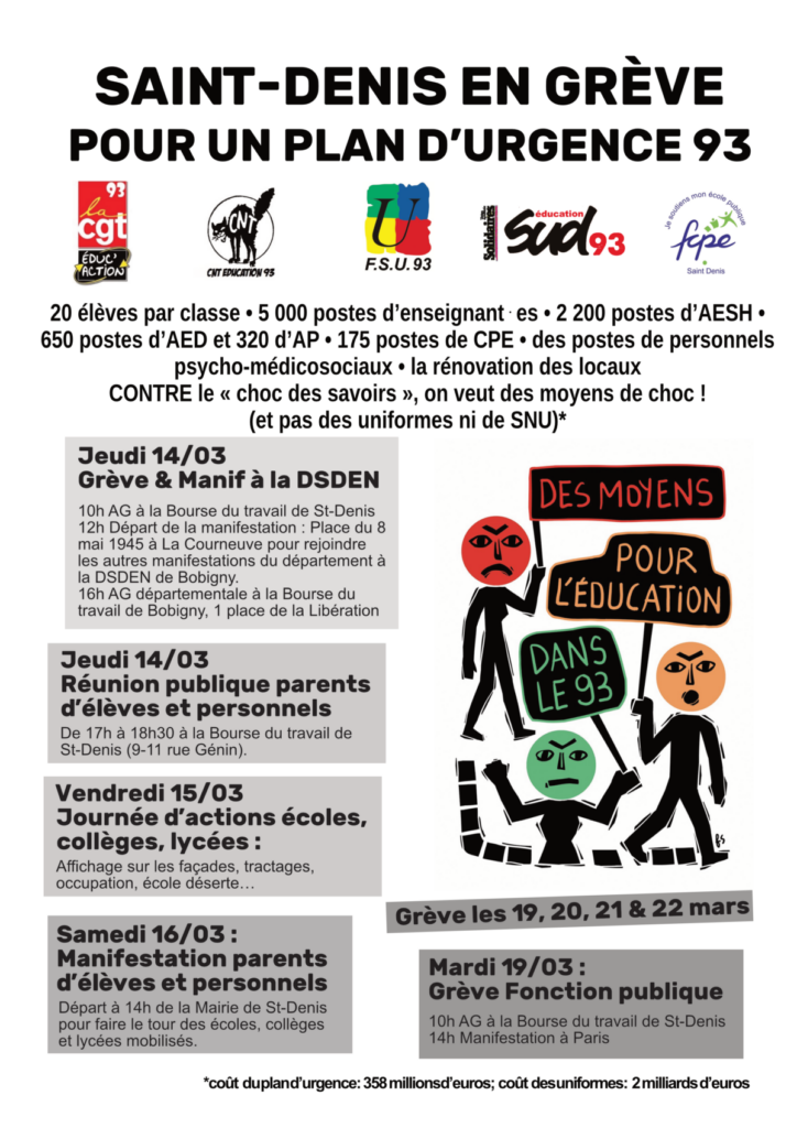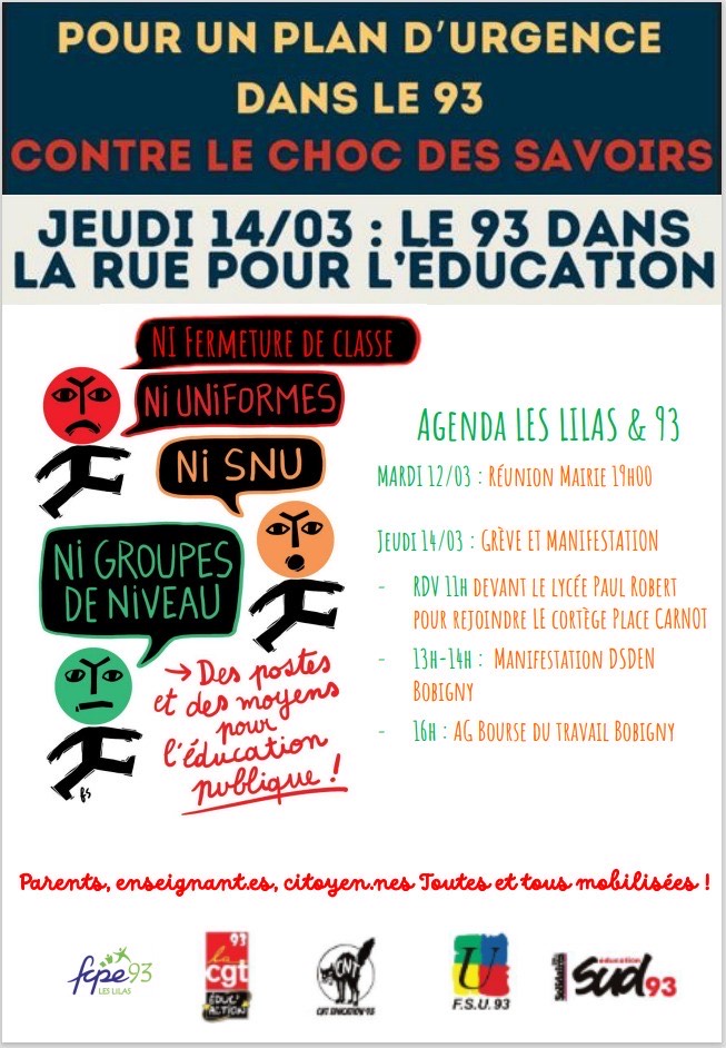 Jeudi 14 mars : Rejoint à 12H la manifestation vers la DSDEN de Bobigny - 12H à la Courneuve, place du 8 mai 1945 !