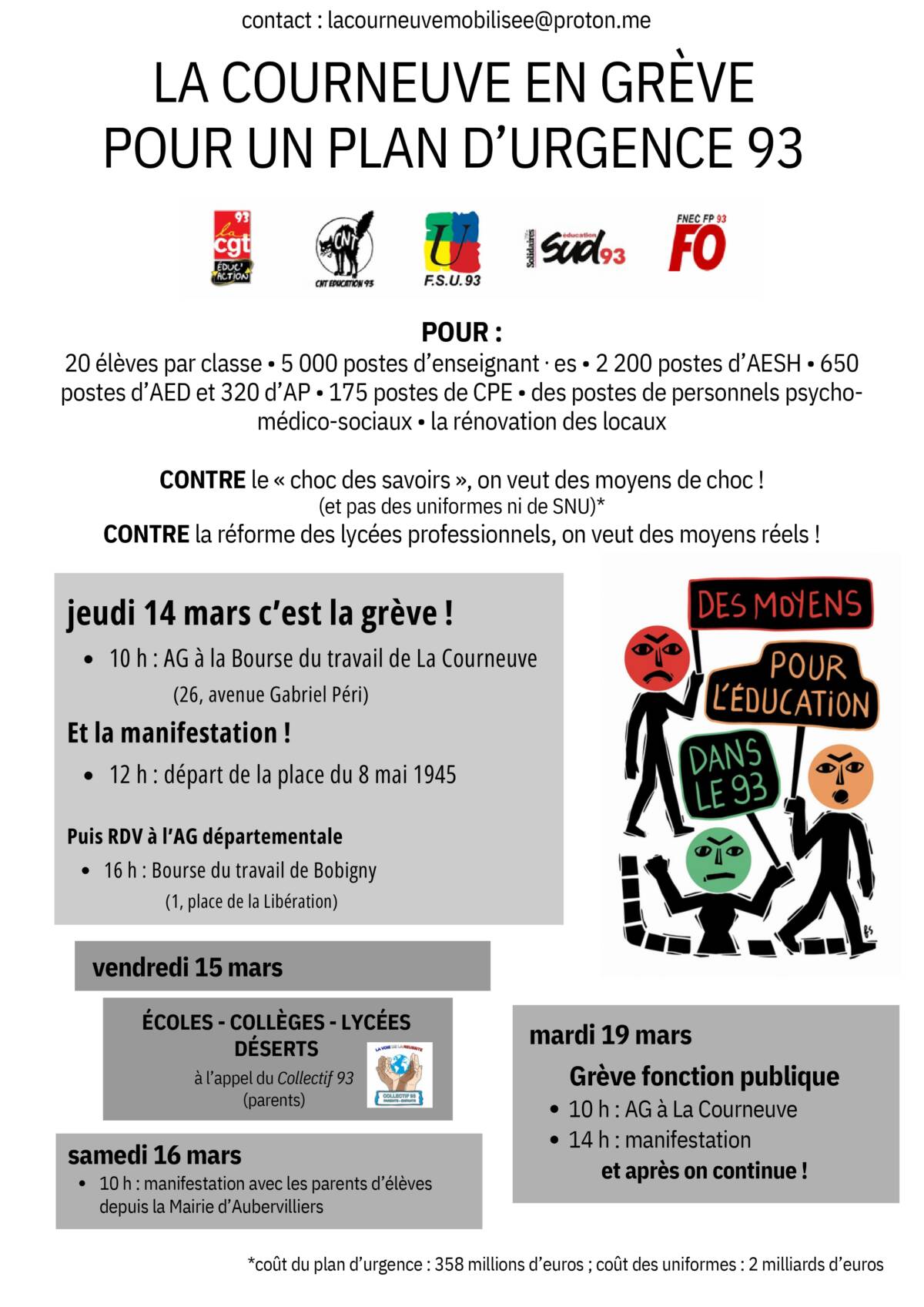 Jeudi 14 mars : Rejoint à 12H la manifestation vers la DSDEN de Bobigny - 12H à la Courneuve, place du 8 mai 1945 !