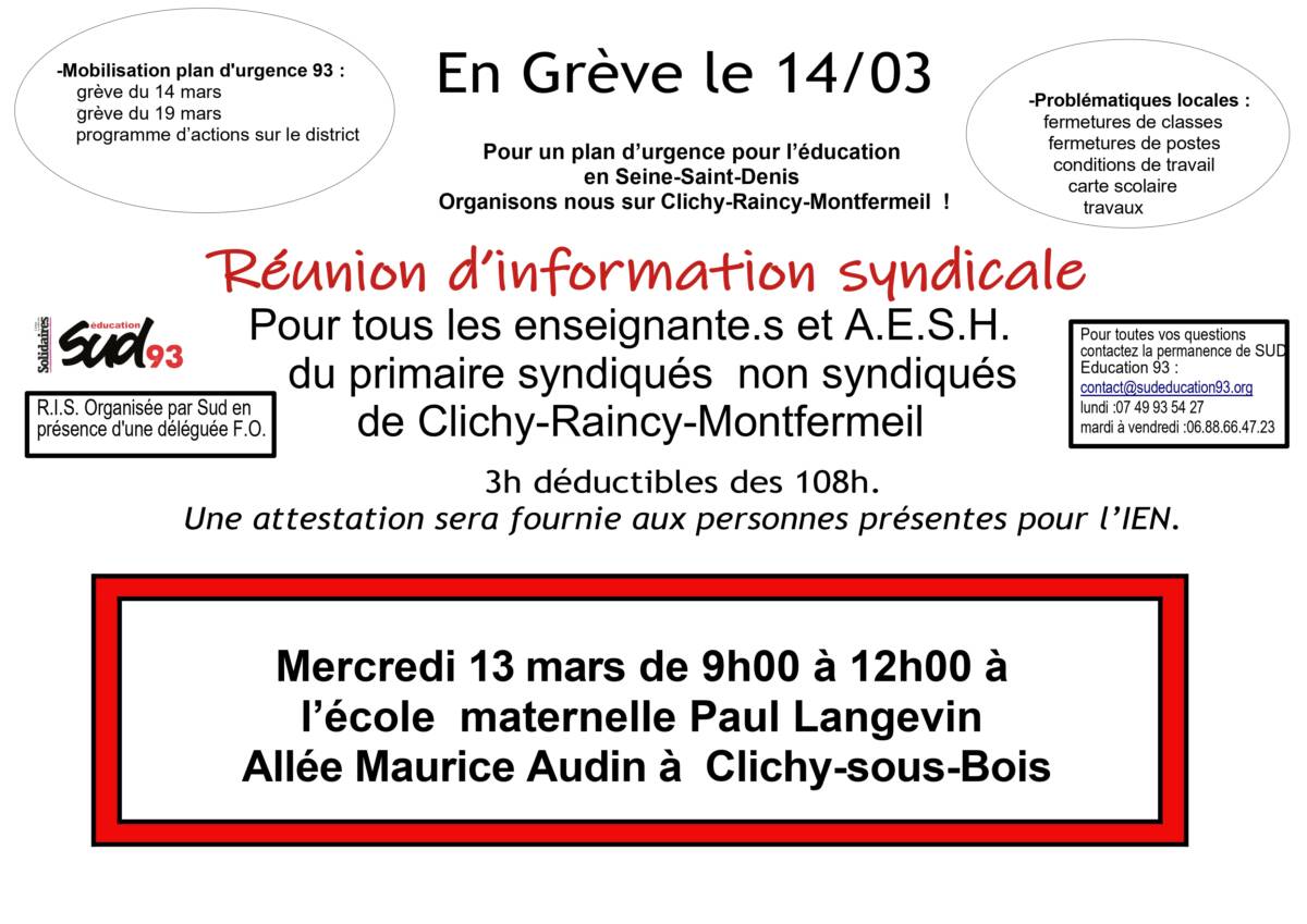 Mercredi 13 mars : Réunion d'information syndicale 1er degré - 9h à 12h - à l'école maternelle Paul Langevein de Clichy
