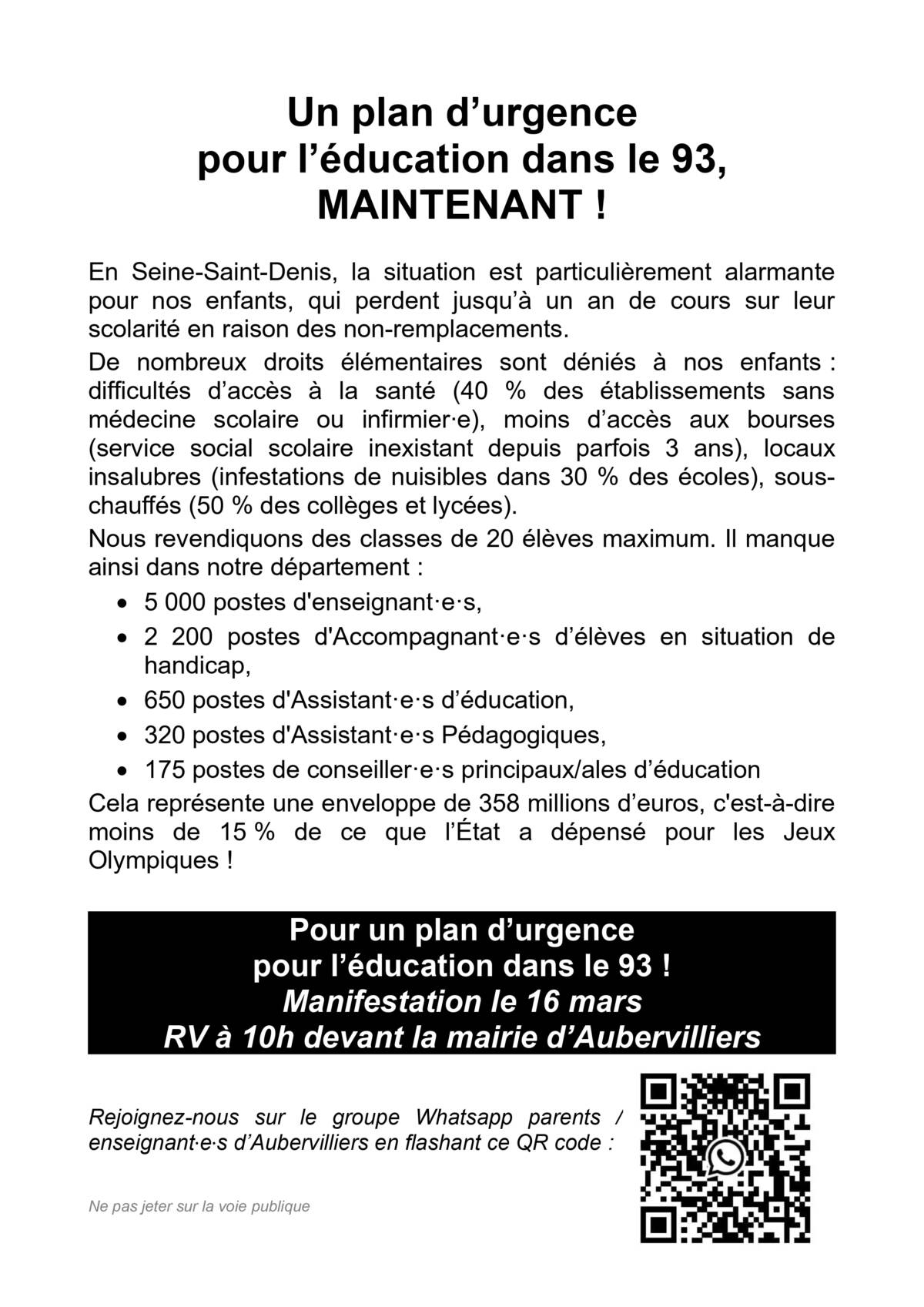 -🔥 ✊ 📣 Samedi 16 mars : Manifestation avec les parents d'élèves ! 10H Mairie d'Aubervilliers !