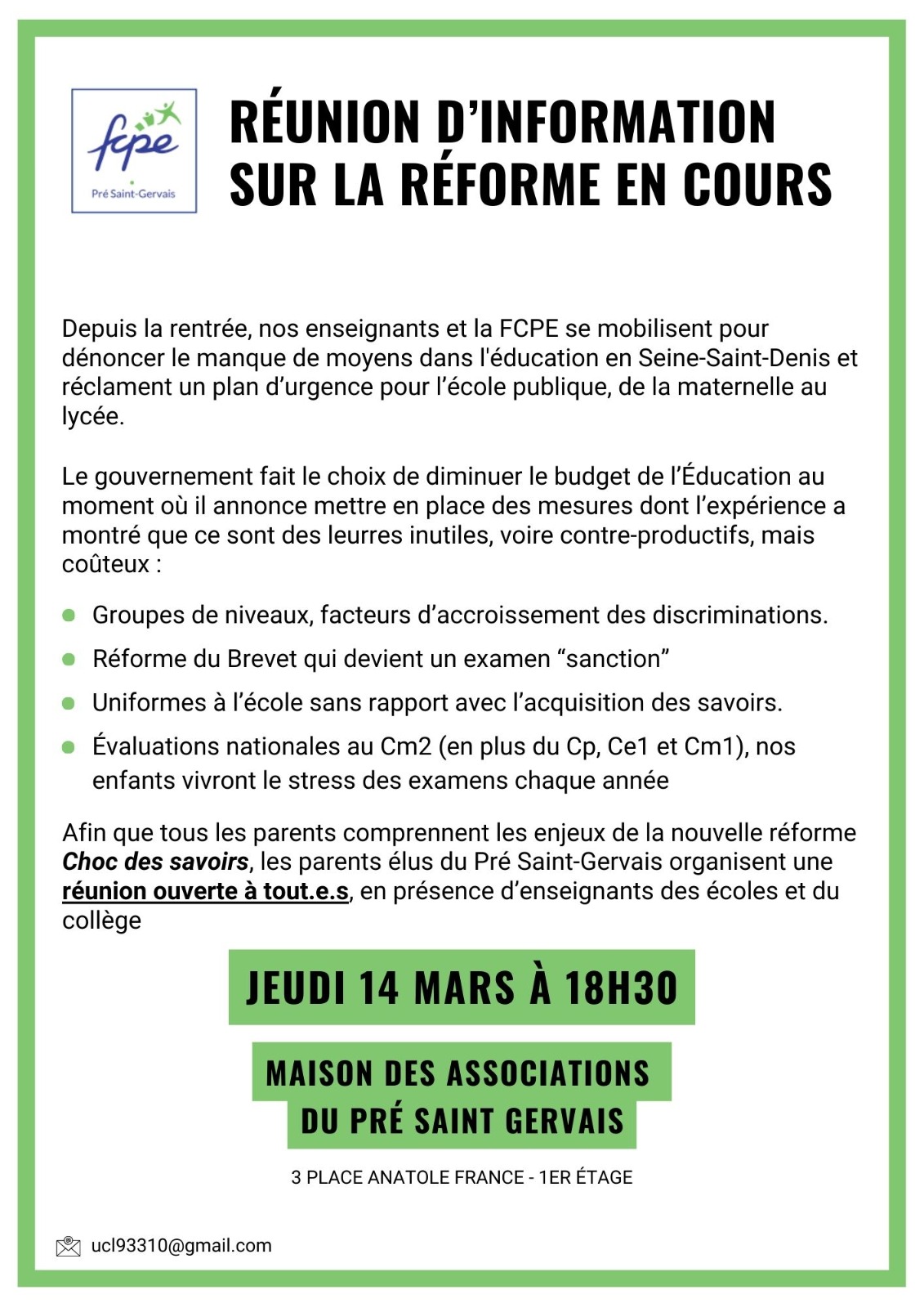 Jeudi 14 mars : 18H30 - Réunion publique d'information à l'initiative de la FCPE - Maison des Associations, 3 place Anatole France.