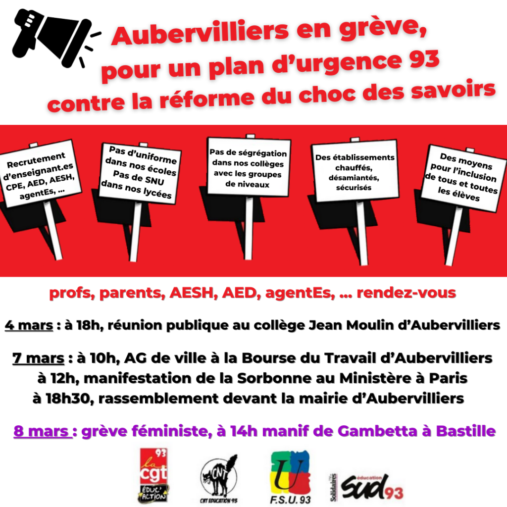 - *Samedi 9 – manifestation locale* : élèves, parents, prof-es, toutes et tous devant la Mairie pour montrer notre détermination ! 11h devant la mairie de Bagnolet.