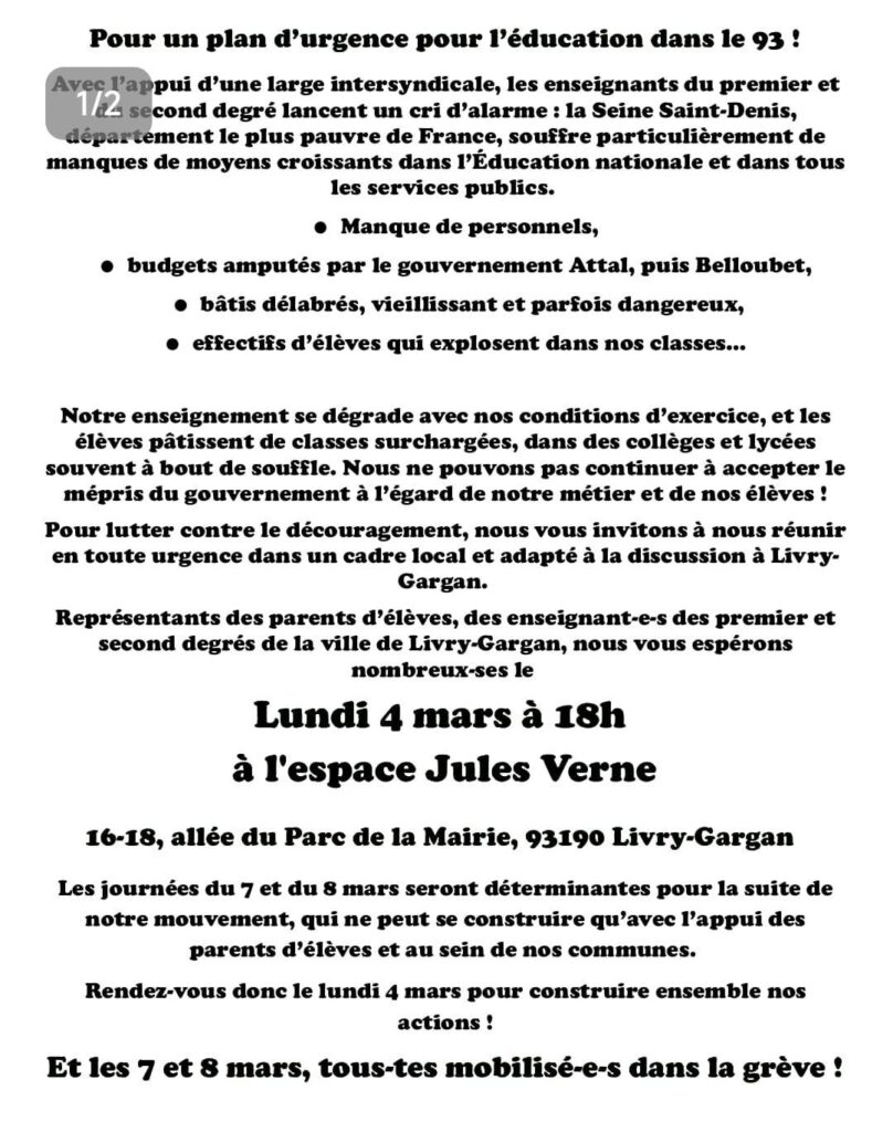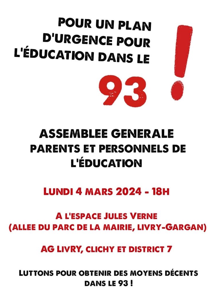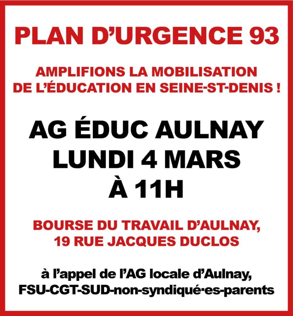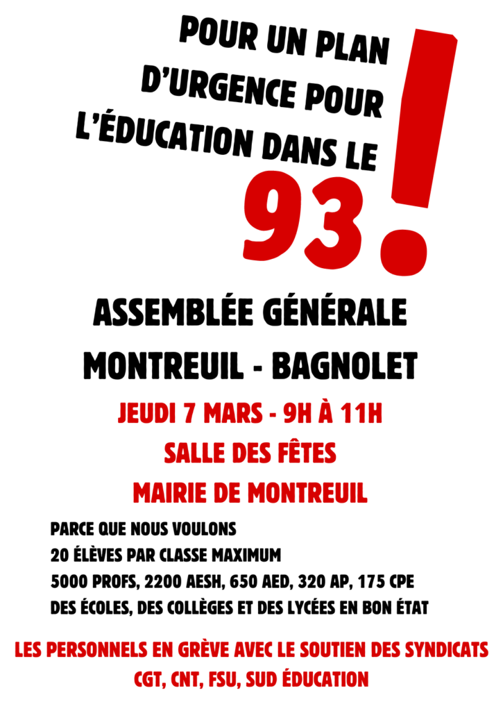 - AG de grève Montreuil Bagnolet : jeudi 7 mars 9h-11h à la salle des fêtes de la mairie de Montreuil.