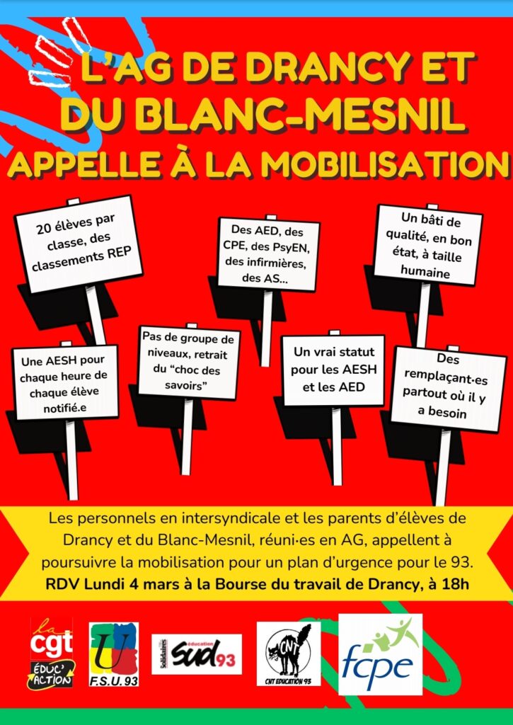 Lundi 4 mars 18h : Assemblée Générale (Drancy - Le Blanc-Mesnil) à la Bourse du Travail de Drancy!