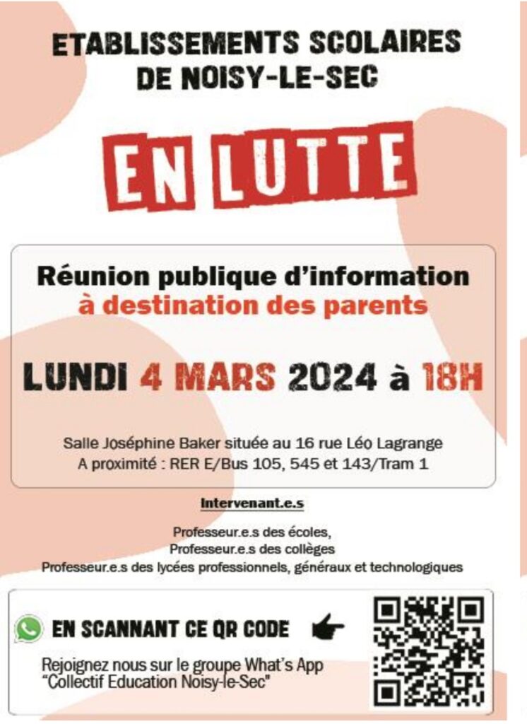 150 personnes étaient réunies à Bagnolet vendredi 1er mars, salle Pierre et Marie Curie : des prof-es des collèges Travail-Langevin et Politzer, du lycée Hénaff, des enseignant-es de maternelle et élémentaires et beaucoup de parents.
