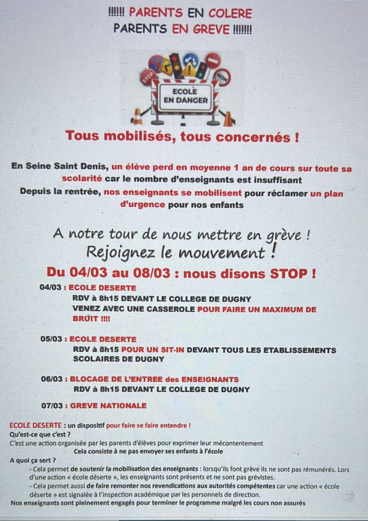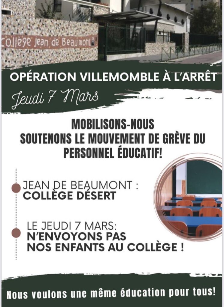 - *Mercredi 6 - opération collèges déserts* : les parents n’envoient pas leurs enfants en cours. RDV à 7h45 devant le collège.