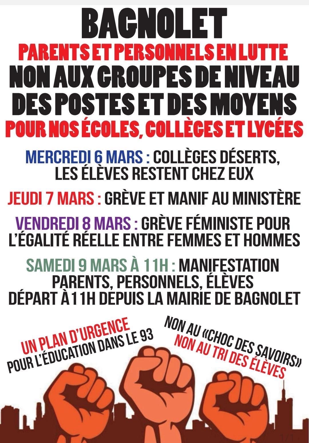- *Samedi 9 – manifestation locale* : élèves, parents, prof-es, toutes et tous devant la Mairie pour montrer notre détermination ! 11h devant la mairie de Bagnolet.