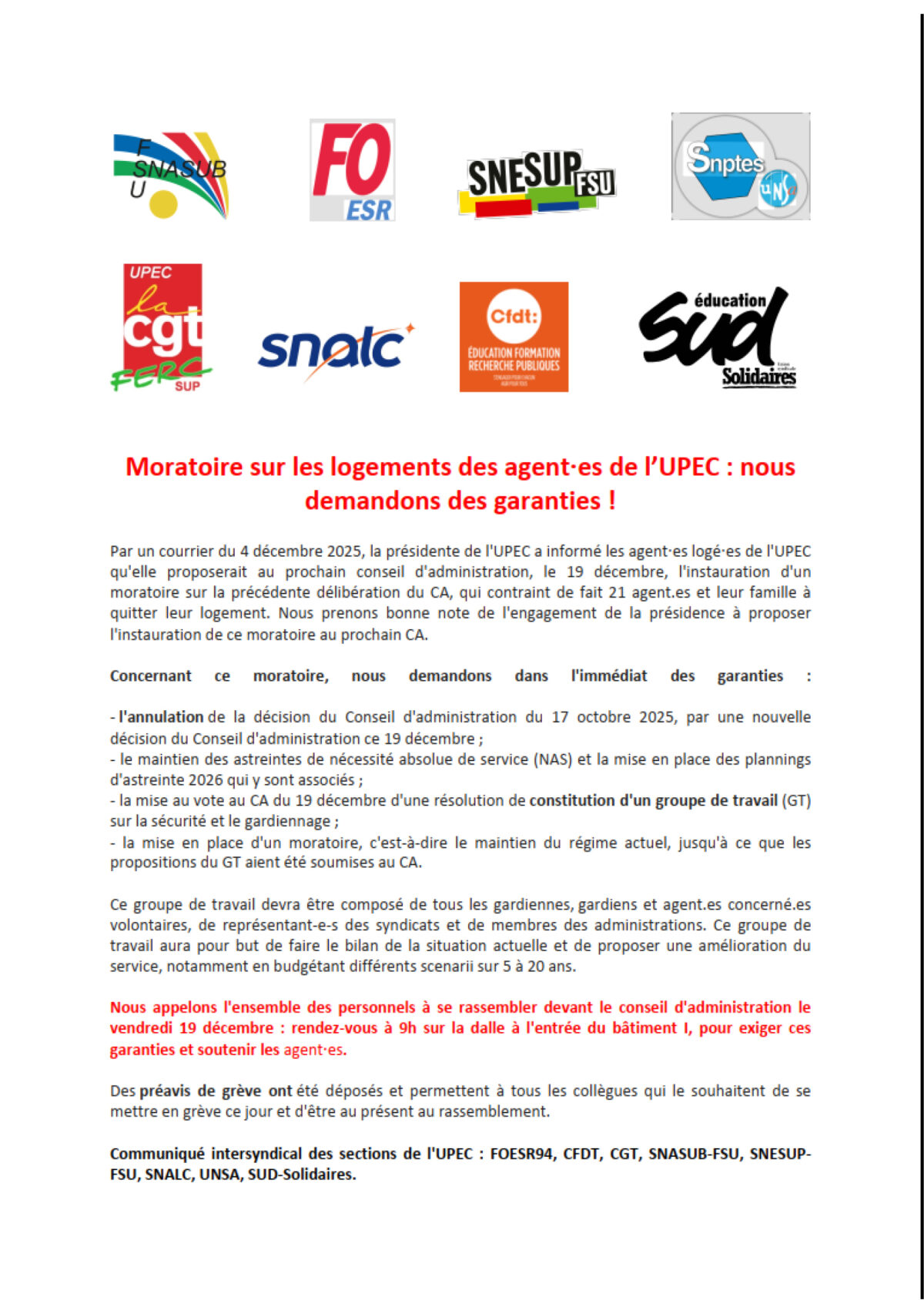 Par un courrier du 4 décembre 2025, la présidente de l'UPEC a informé les agent·es logé·es de l'UPEC qu'elle proposerait au prochain conseil d'administration, le 19 décembre, l'instauration d'un moratoire sur la précédente délibération du CA, qui contraint de fait 21 agent.es et leur famille à quitter leur logement. Nous prenons bonne note de l'engagement de la présidence à proposer l'instauration de ce moratoire au prochain CA.