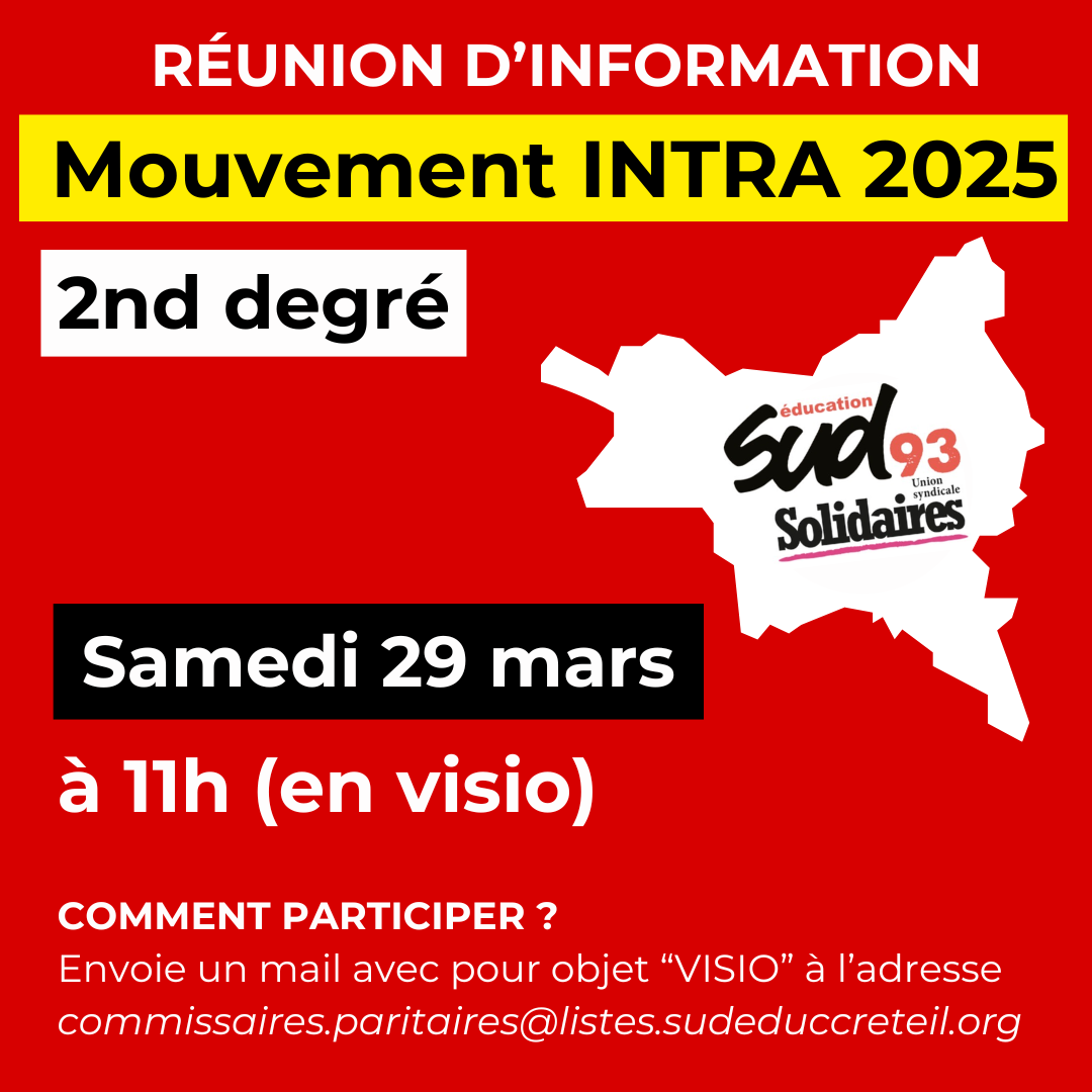 Une réunion d’information sur les mutations intra-académiques est organisée, en visio conférence le samedi 29 mars, à 11h. Pour recevoir le lien de la visio, envoyer un mail à l’adresse commissaires.paritaires@listes.sudeduccreteil.org avec pour objet "Visio".