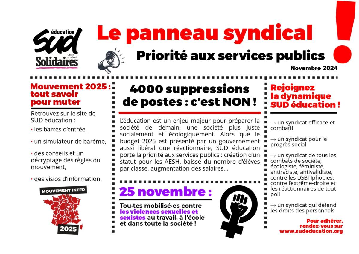 Panneau syndical du mois de novembrePublié le 08/11/2024Téléchargez et diffusez le panneau syndical de SUD éducation, novembre 2024