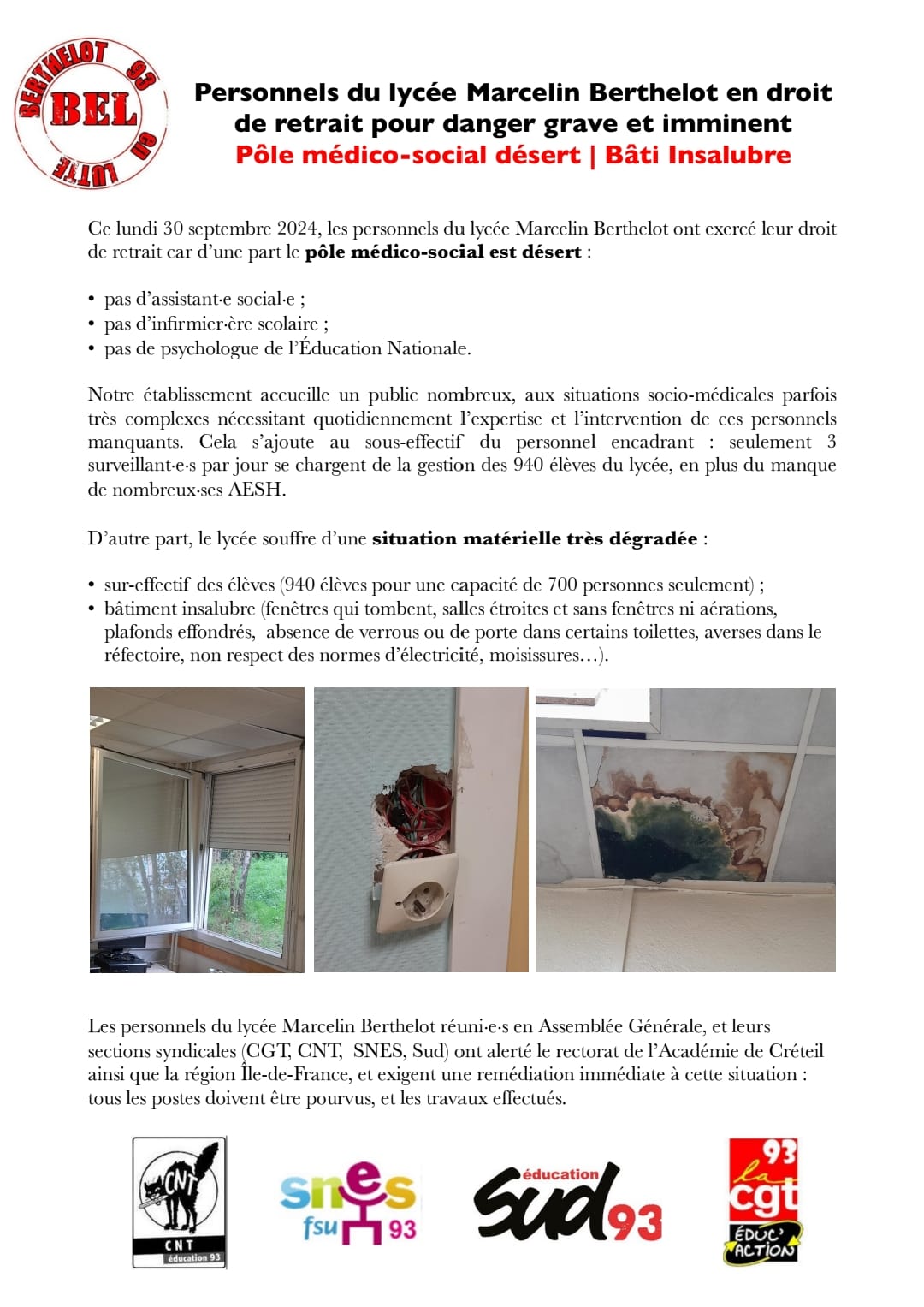 Ce lundi 30 septembre 2024, les personnels du lycée Marcelin Berthelot ont exercé leur droit de retrait car d'une part le pôle médico-social est désert :