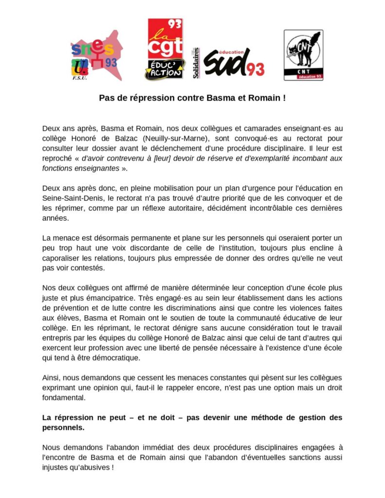 Deux ans après, Basma et Romain, nos deux collègues et camarades enseignant·es au collège Honoré de Balzac (Neuilly-sur-Marne), sont convoqué·es au rectorat pour consulter leur dossier avant le déclenchement d’une procédure disciplinaire. Il leur est reproché « d’avoir contrevenu à [leur] devoir de réserve et d’exemplarité incombant aux fonctions enseignantes ».