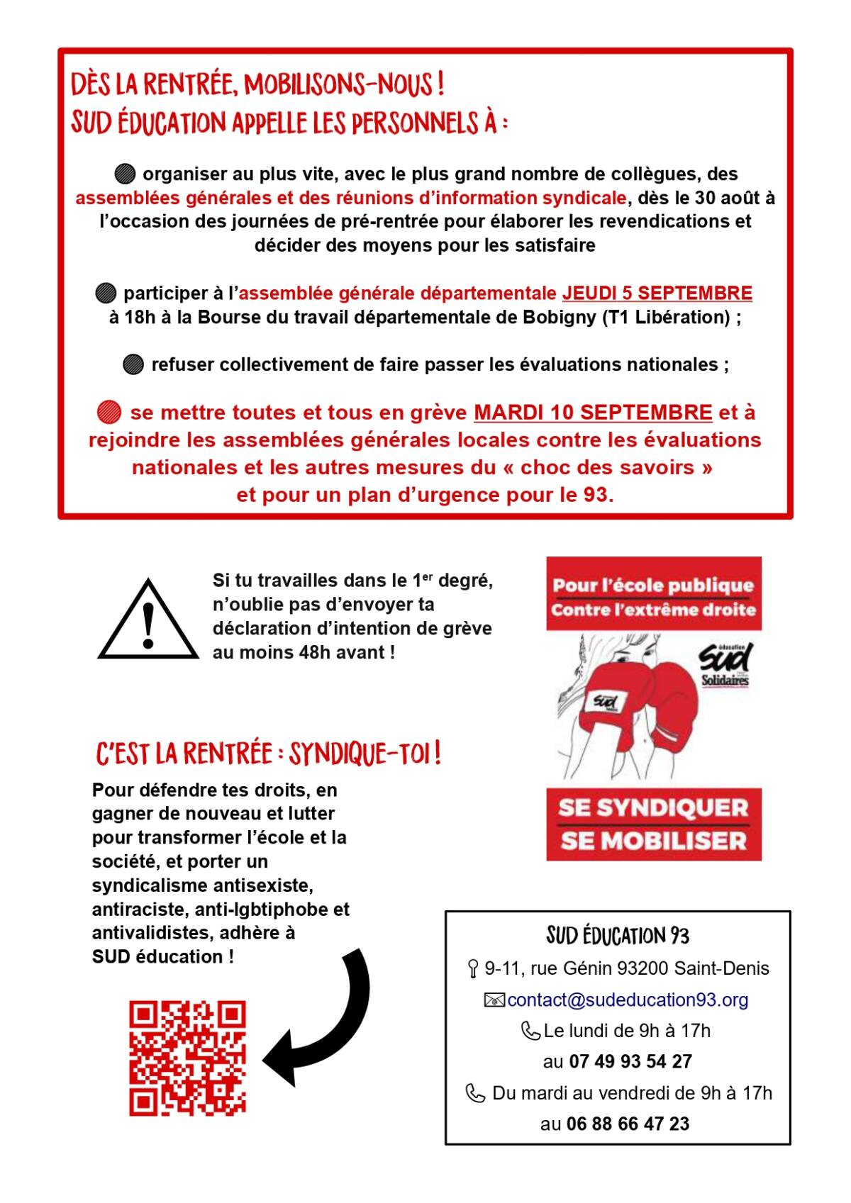 🔴 se mettre toutes et tous en grève MARDI 10 SEPTEMBRE et à rejoindre les assemblées générales locales contre les évaluations nationales et les autres mesures du « choc des savoirs » et pour un plan d’urgence pour le 93.