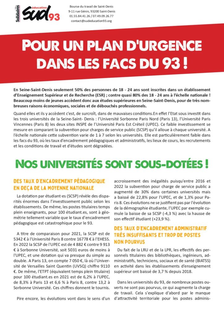 Quand elles et ils y accèdent c’est, de surcroît, dans de mauvaises conditions.En effet l’Etat sous investit dans les trois universités de la Seine-Saint- Denis : l’Université Sorbonne Paris Nord (Paris 13), l’Université Paris Vincennes (Paris 8) les deux sites INSPE de l’Université Paris Est Créteil (UPEC). Ce faible investissement se mesure en comparant la subvention pour charges de service public (SCSP) qu’il alloue à chaque université. A l’échelle nationale cette subvention varie de 1 à 7 selon les universités. Elle est particulièrement faible dans les facs du 93, où les taux d’encadrement pédagogiques et administratifs, les lieux de cours, les recrutements et les conditions de travail et d’études sont dégradées.