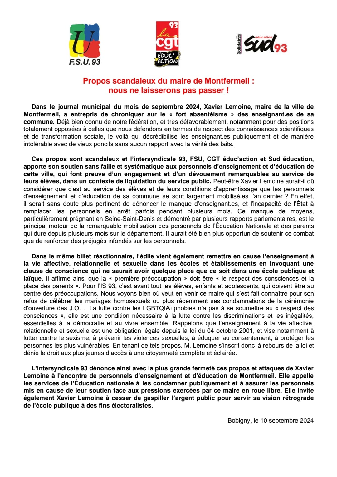 Cette publication a été taggée avec les termes suivant :0Antisexisme et droits LGBTQIA+Conditions de travailIntersyndicalMontfermeil