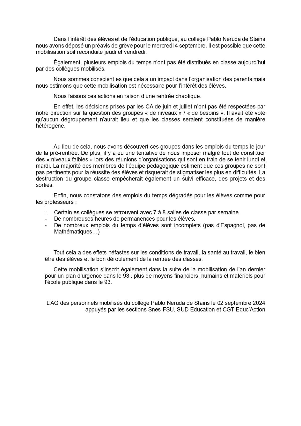 L’AG des personnels mobilisés du collège Pablo Neruda de Stains le 02 septembre 2024 appuyés par les sections Snes-FSU, SUD Education et CGT Educ’Action