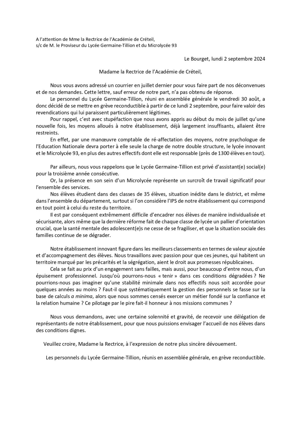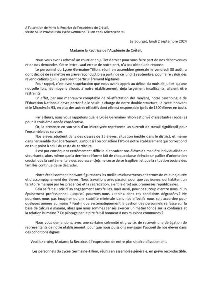 Le personnel du Lycée Germaine-Tillion, réuni en assemblée générale le vendredi 30 août, a donc décidé de se mettre en grève reconductible à partir de ce lundi 2 septembre, pour faire valoir des revendications qui lui paraissent particulièrement légitimes.