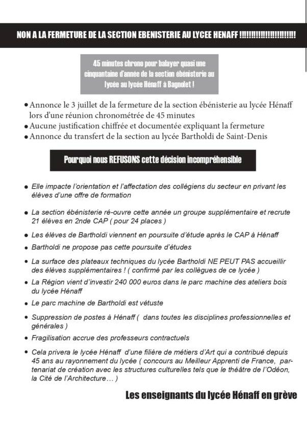 Cela privera le lycée Hénaff d’une filière de métiers d’Art qui a contribué depuis 45 ans au rayonnement du lycée ( concours au Meilleur Apprenti de France, partenariat de création avec les structures culturelles tels que le théâtre de l’Odéon, la Cité de l’Architecture… )