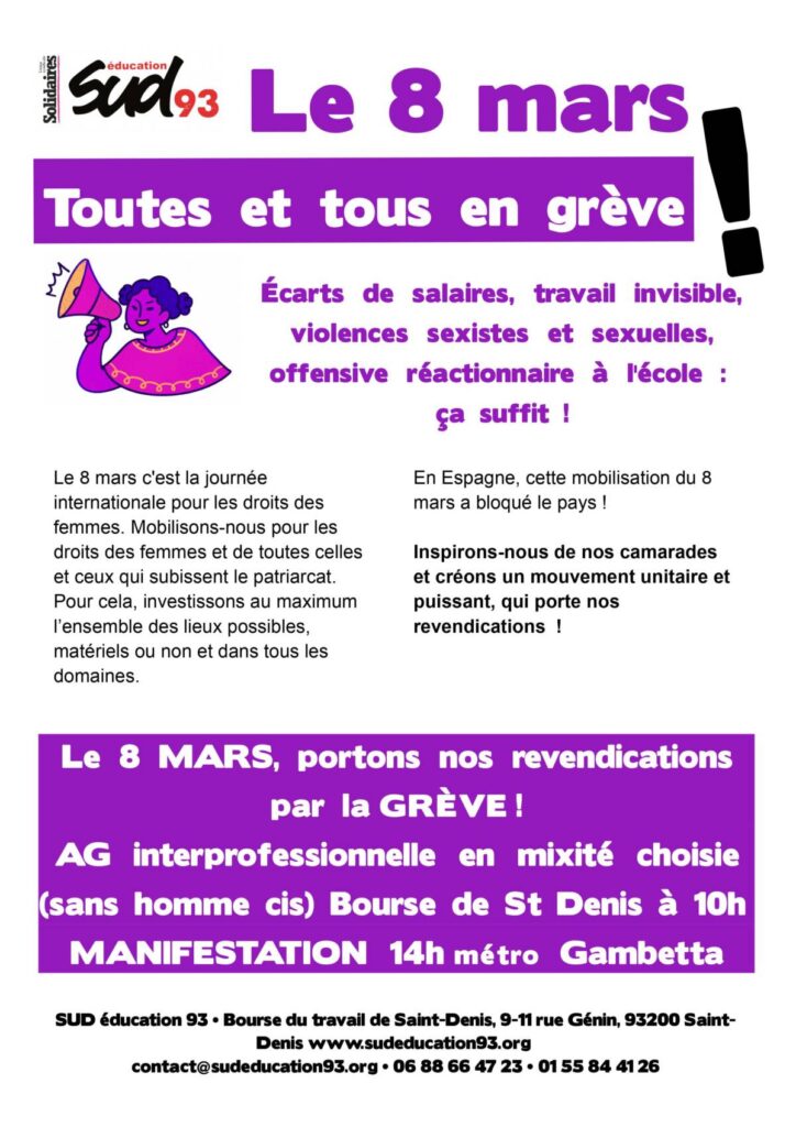 Le 8 mars c'est la journée internationale pour les droits des femmes. Mobilisons-nous pour les droits des femmes et de toutes celles et ceux qui subissent le patriarcat. Pour cela, investissons au maximum l’ensemble des lieux possibles, matériels ou non et dans tous les domaines.