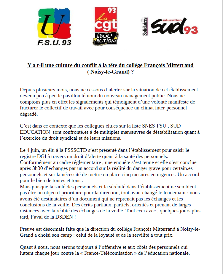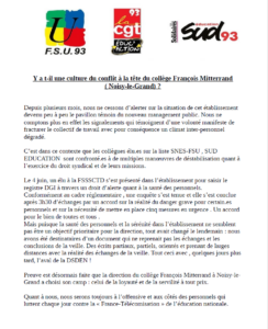 Y a t-il une culture du conflit à la tête du collège François Mitterrand (Noisy-le-Grand) ?